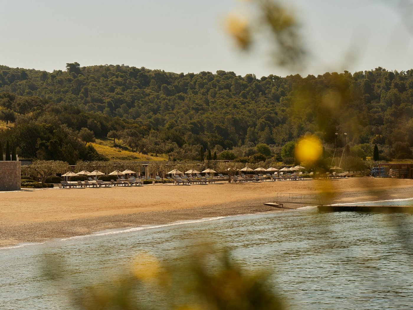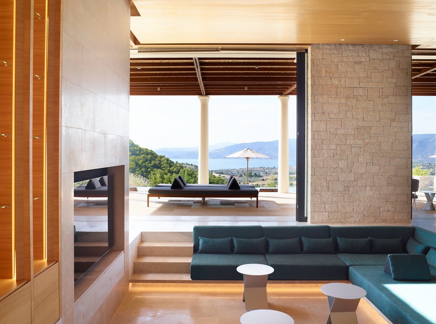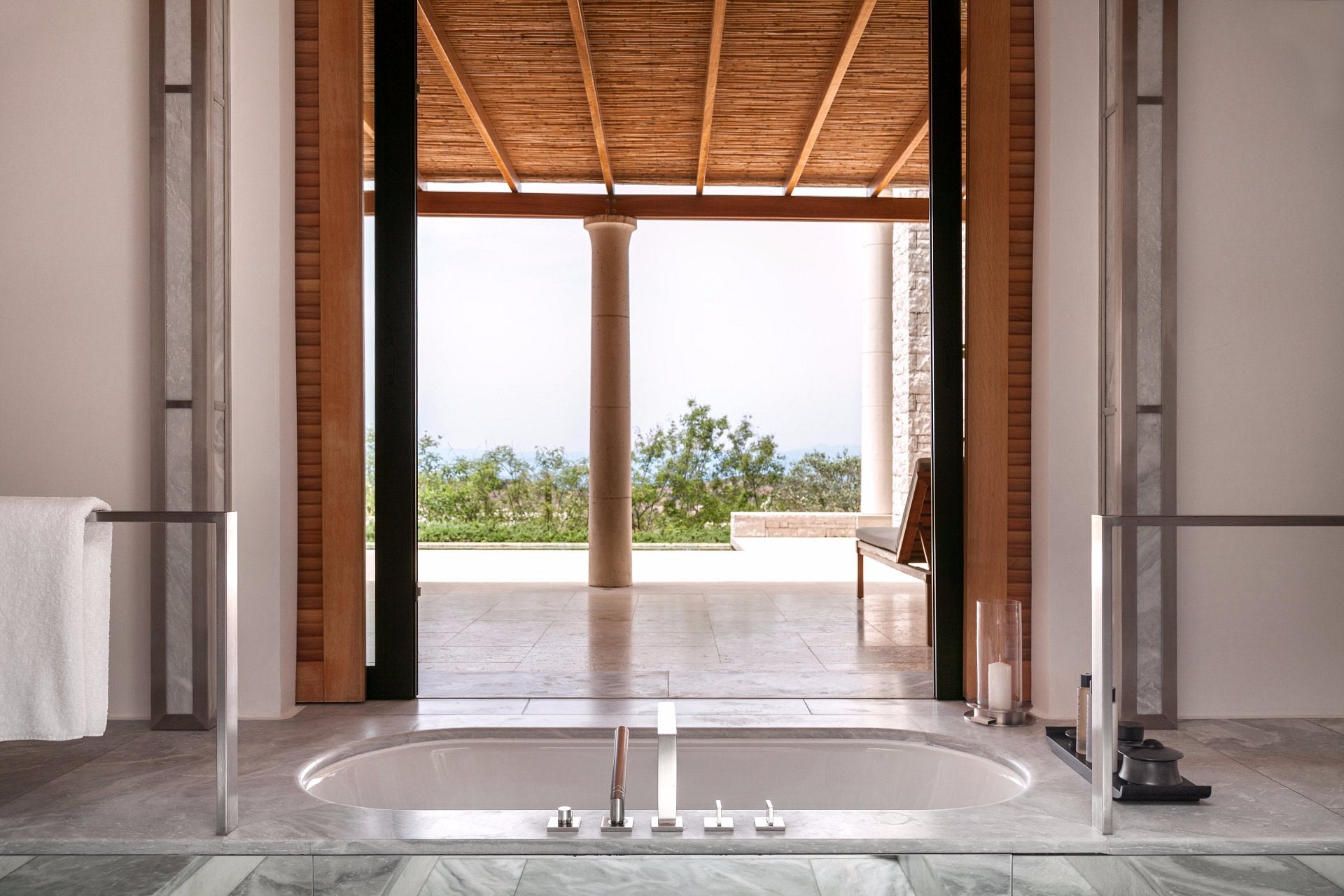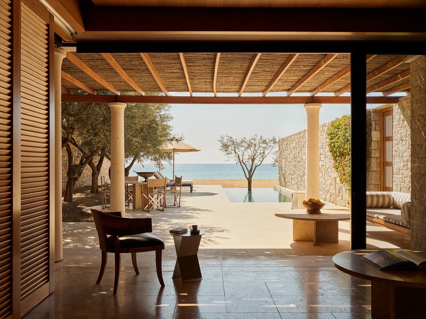 Spacious pavilions and villas open to private pools and terraces, designed to invite in sea breezes and natural light. Interiors are cool and serene, marked by soft tones, marble details, and refined simplicity that reflects the quiet beauty of Greece. Every space feels thoughtfully composed, connecting guests to the landscape and the slow rhythm of Mediterranean life.