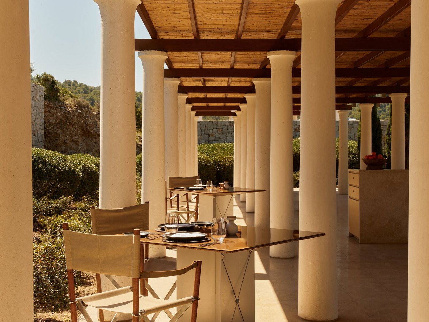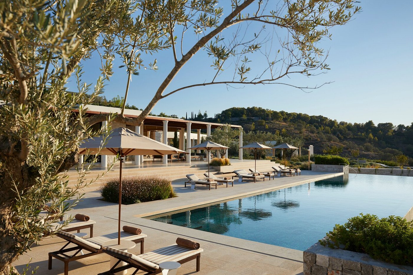 Amanzoe rests on a peaceful Peloponnesian hillside overlooking the Aegean Sea, surrounded by olive groves and fragrant countryside. The resort feels private and open at once, offering panoramic views of blue waters and rolling hills. Its architecture draws inspiration from classical Greek design, with stone colonnades, open courtyards, and gentle light creating a calm and timeless atmosphere.