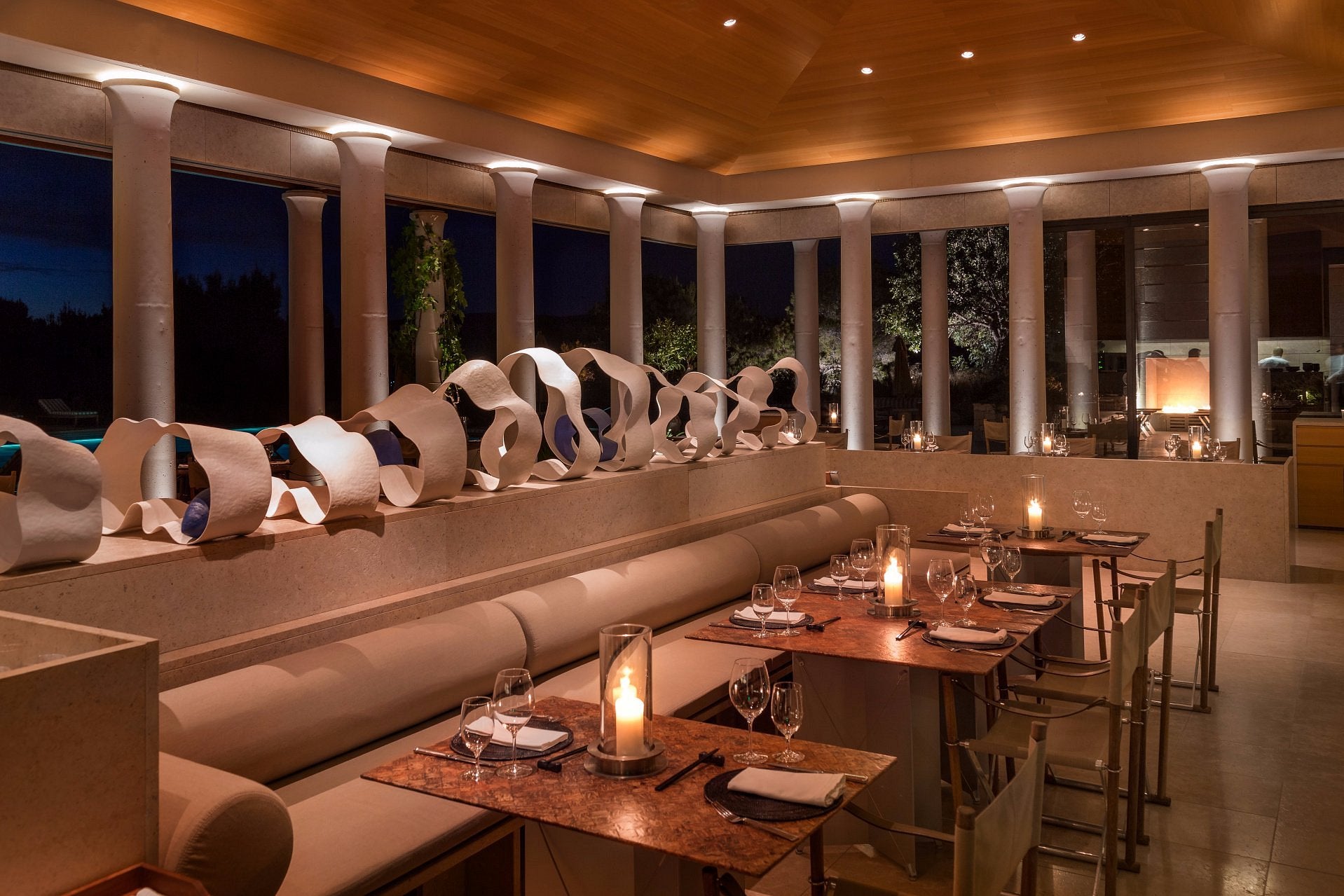 • The Bar – An inviting space for cocktails and aperitifs, where guests can enjoy soft light and views of the surrounding hills.
