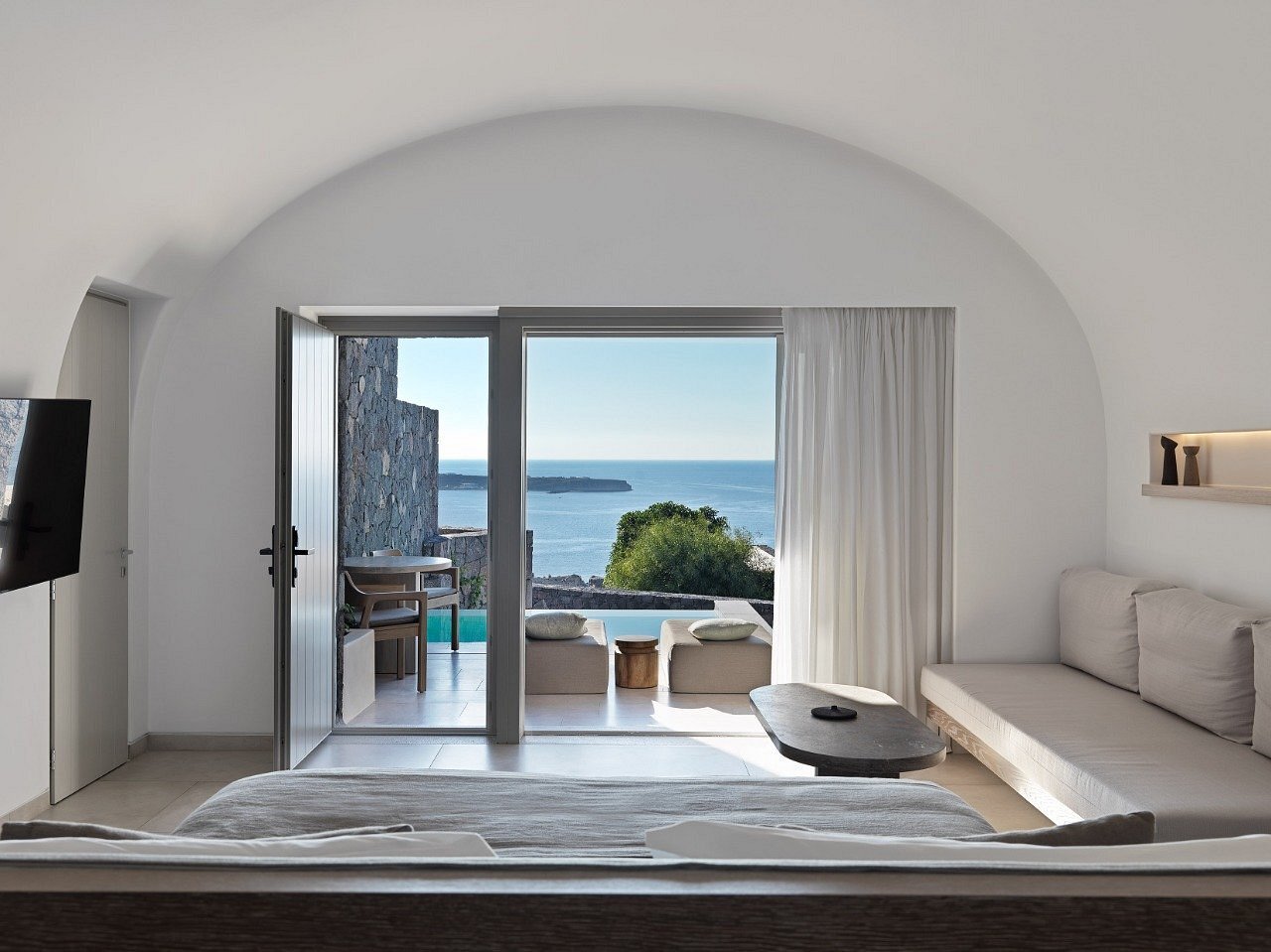 Canaves Oia Epitome sits on a peaceful hillside just above the fishing village of Ammoudi, offering sweeping views of the Aegean Sea and Santorini’s famous sunsets. Designed with a modern Cycladic touch, the property feels airy and intimate, with clean lines, soft earth tones, and natural stone blending into the island landscape.