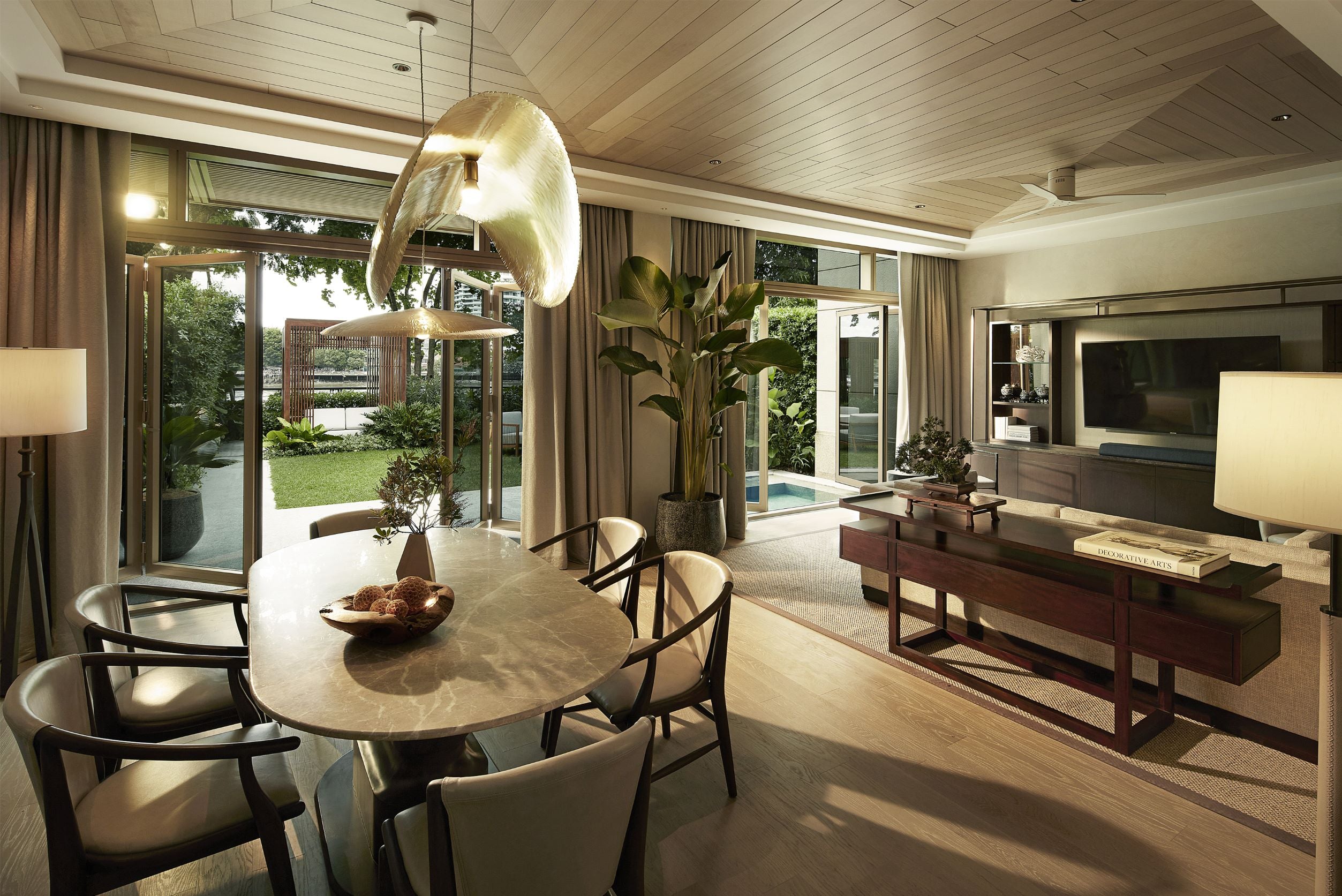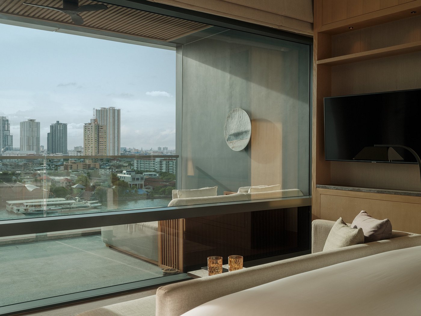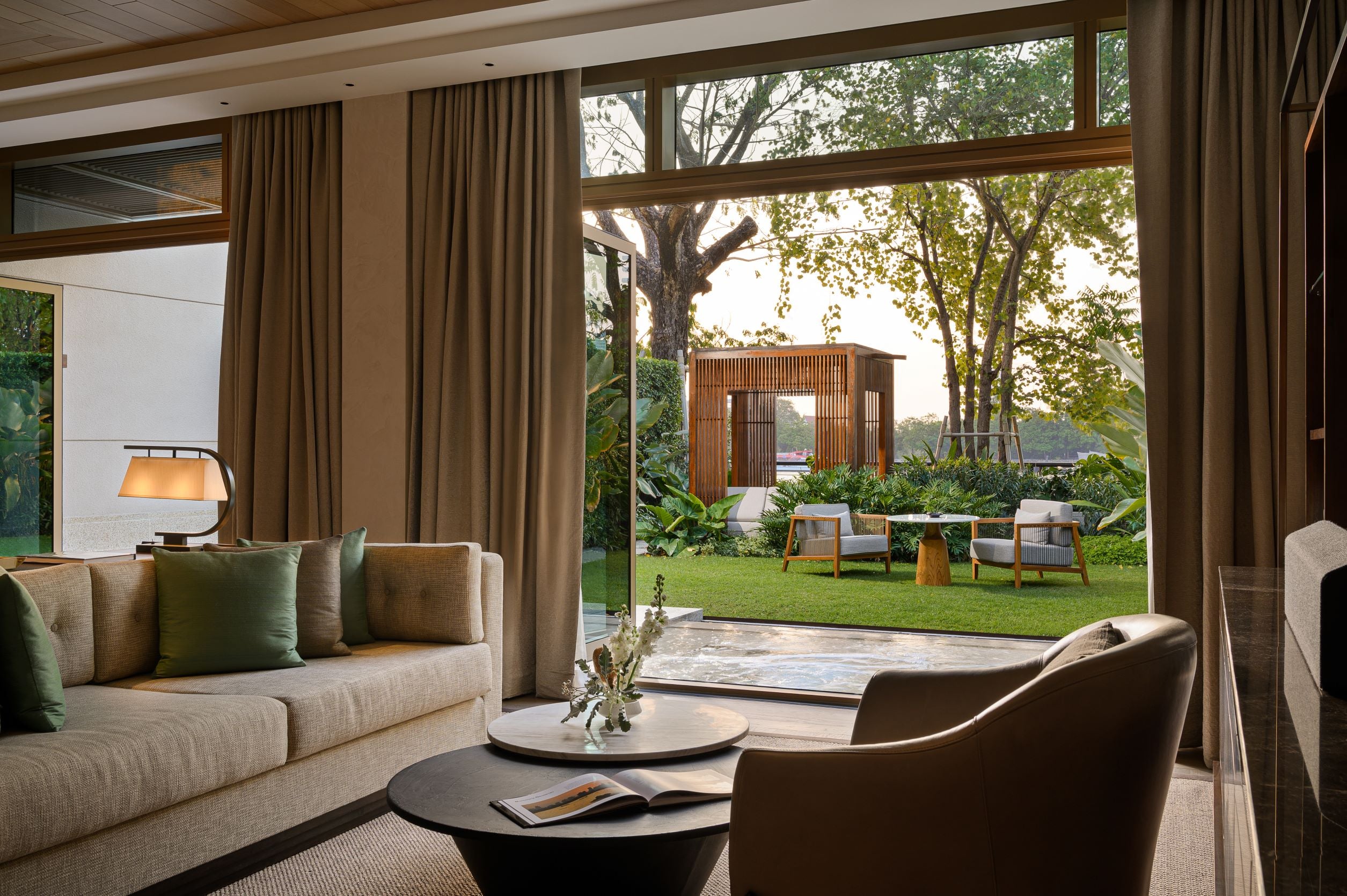 Rooms and suites open onto uninterrupted water views, with floor-to-ceiling windows, private balconies or terraces, and interiors that feel warm, contemporary, and gently influenced by Thai craftsmanship. The riverside villas add another level of privacy, each with its own plunge pool and outdoor sala, creating a truly residential atmosphere.