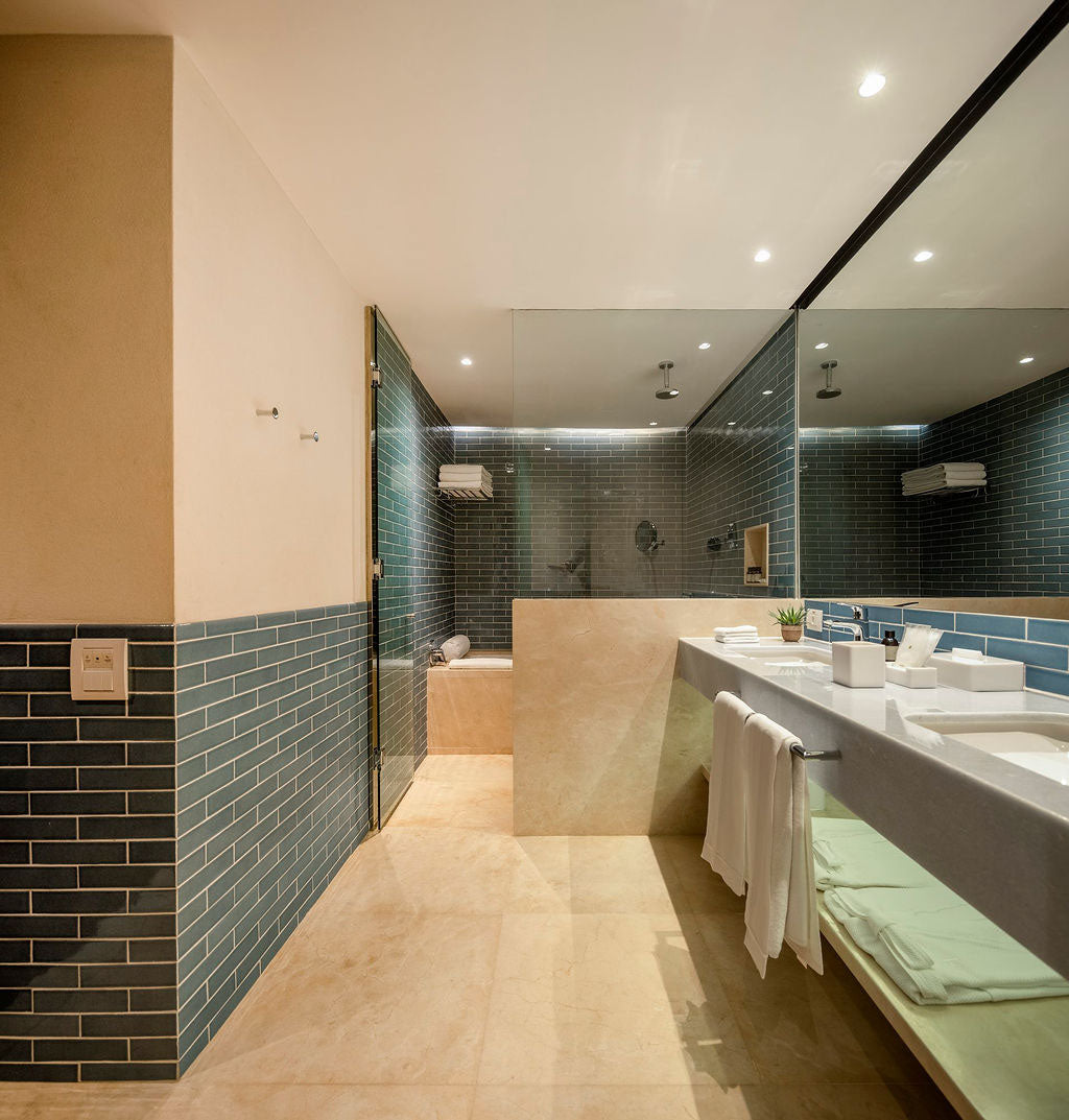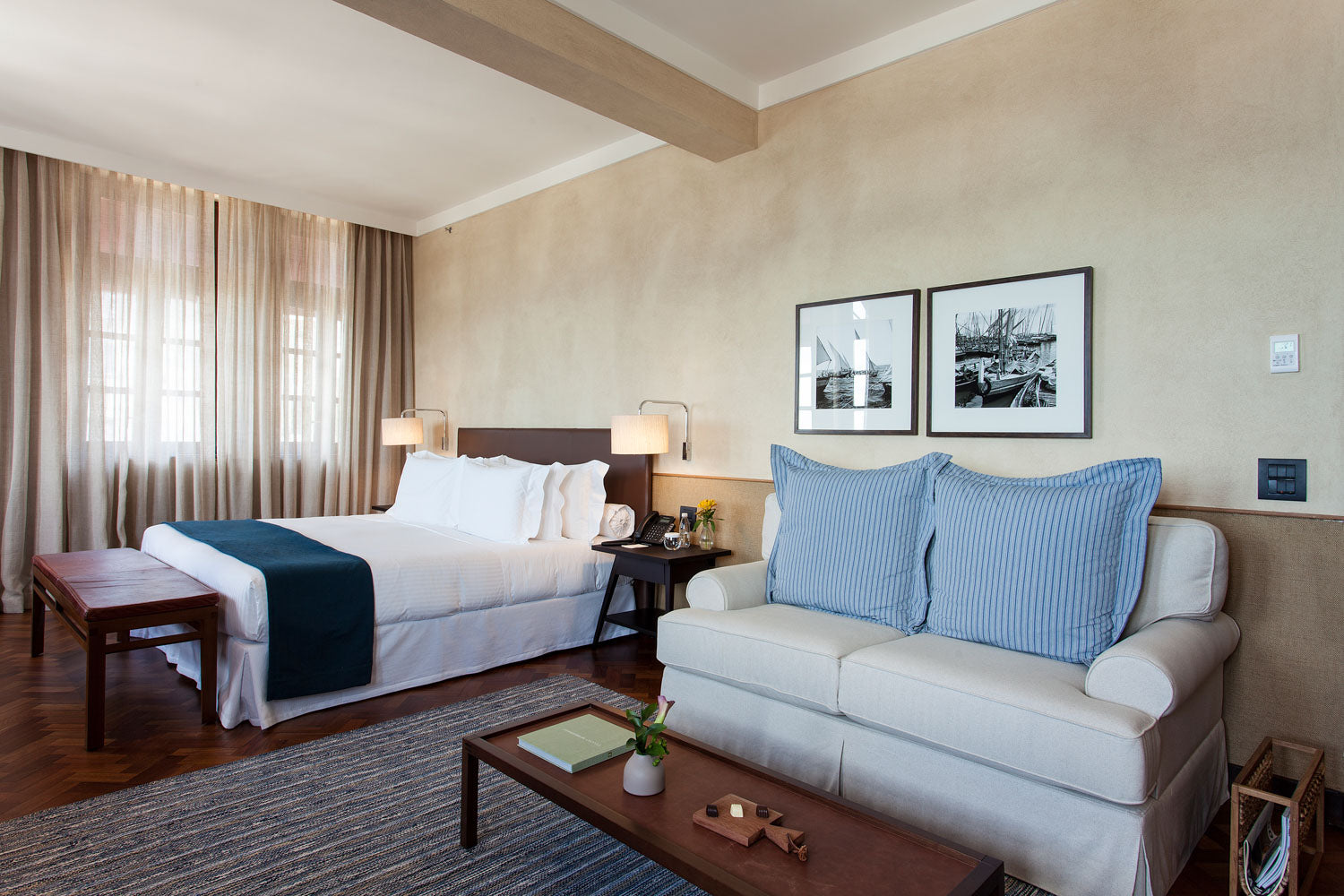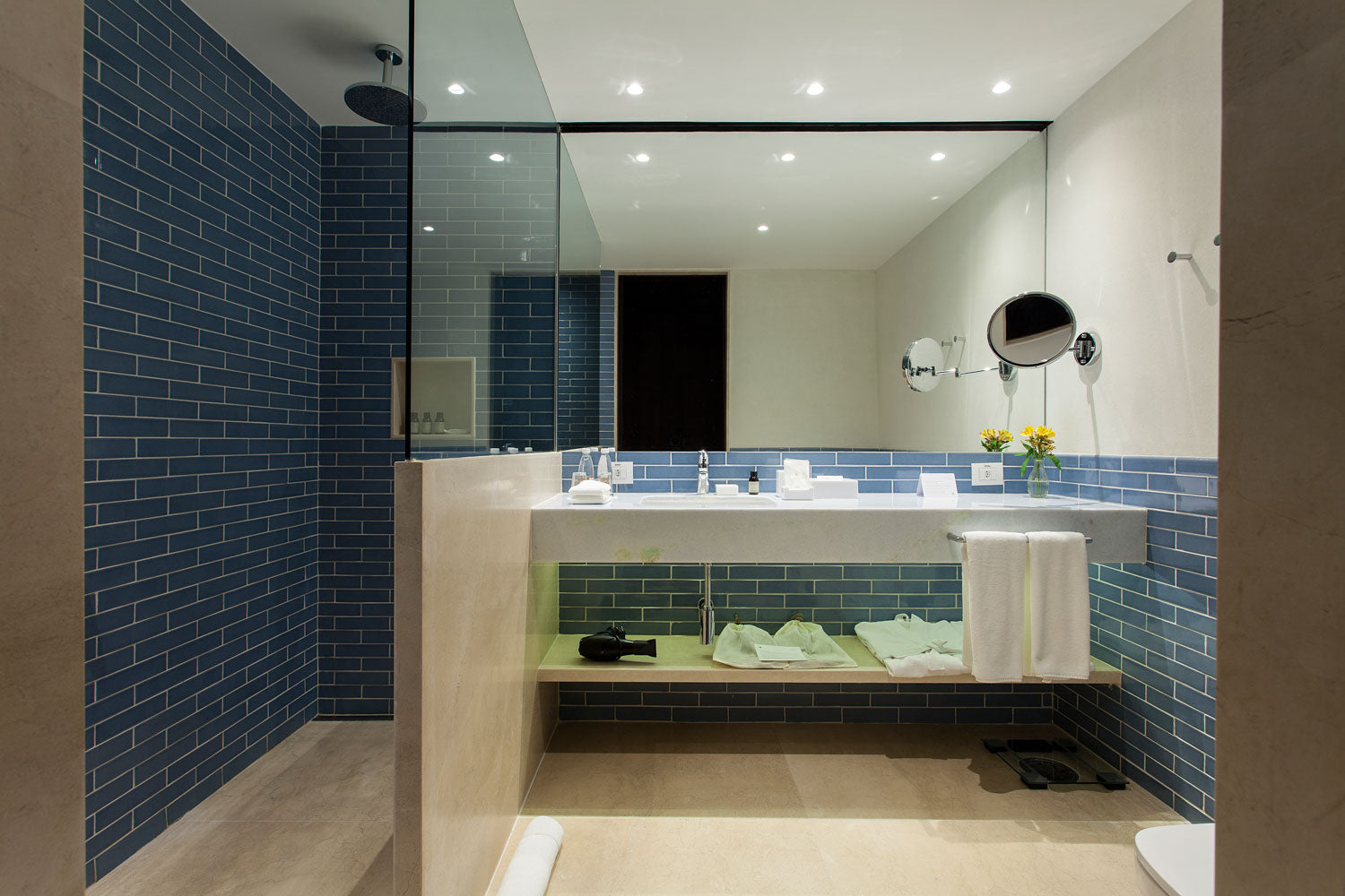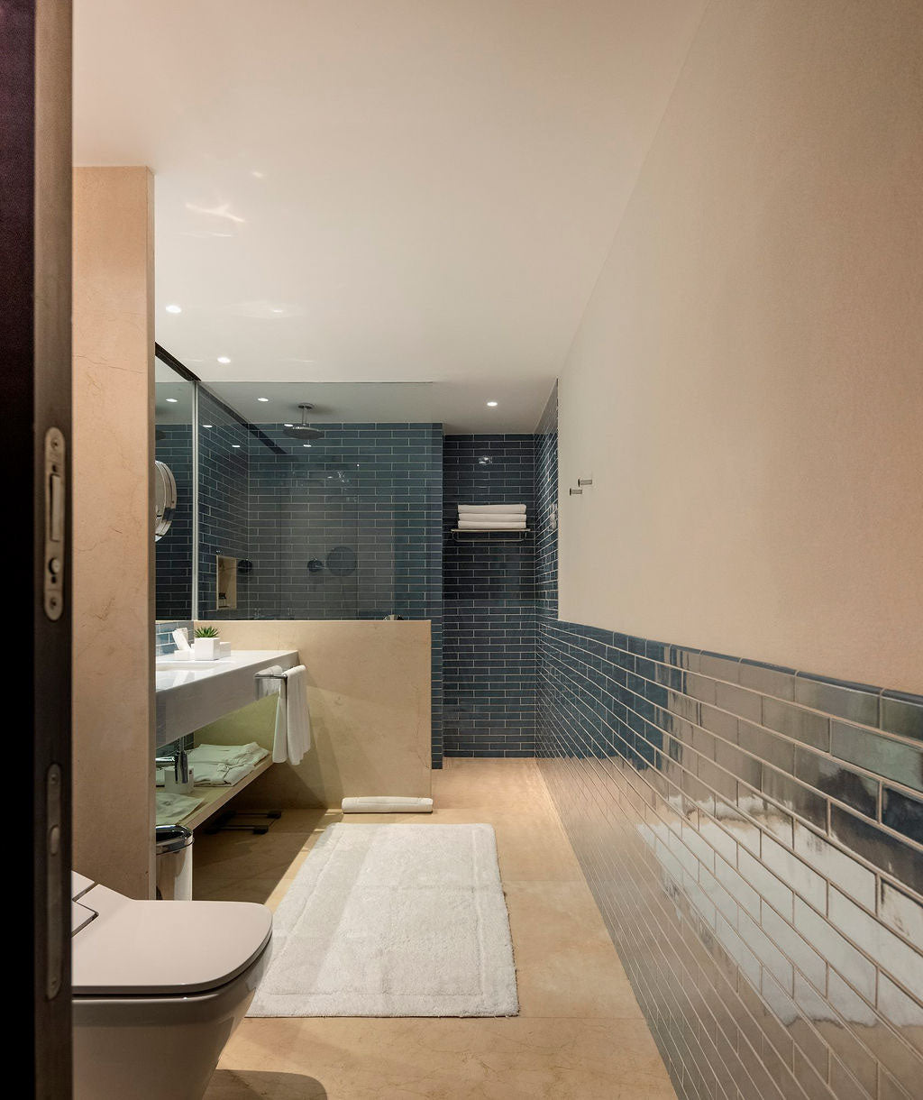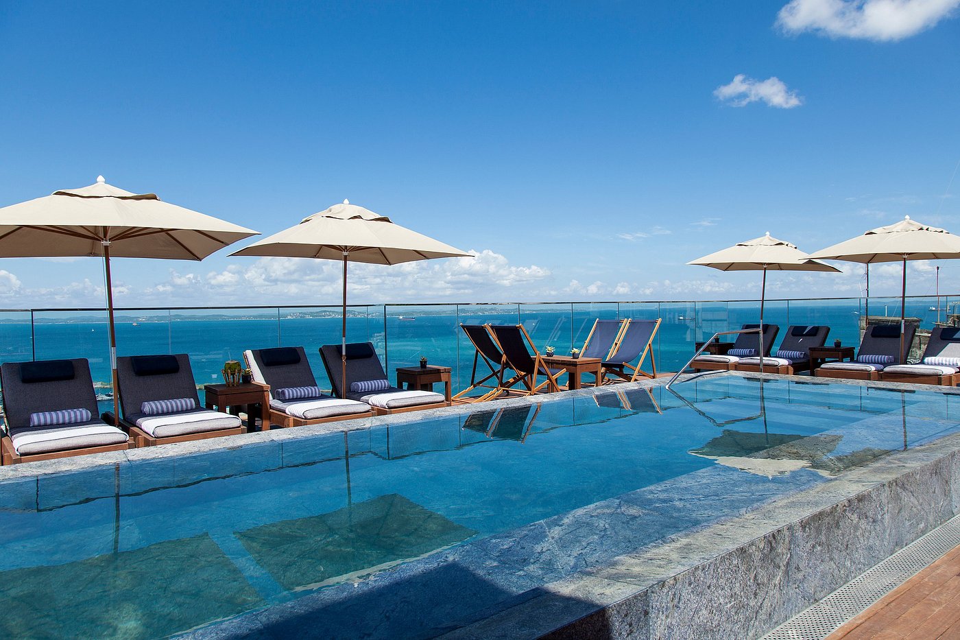 Inside, the 70 rooms draw inspiration from local craftsmanship — hand-painted ceramics, deep blues in textiles, and nods to the region’s heritage create a calm, cultured atmosphere. On the rooftop, you’ll find a pool deck made with Azul Bahia granite and a sun deck that feels suspended above the city, offering a quiet retreat with panoramic bay views.