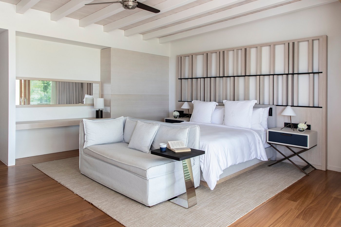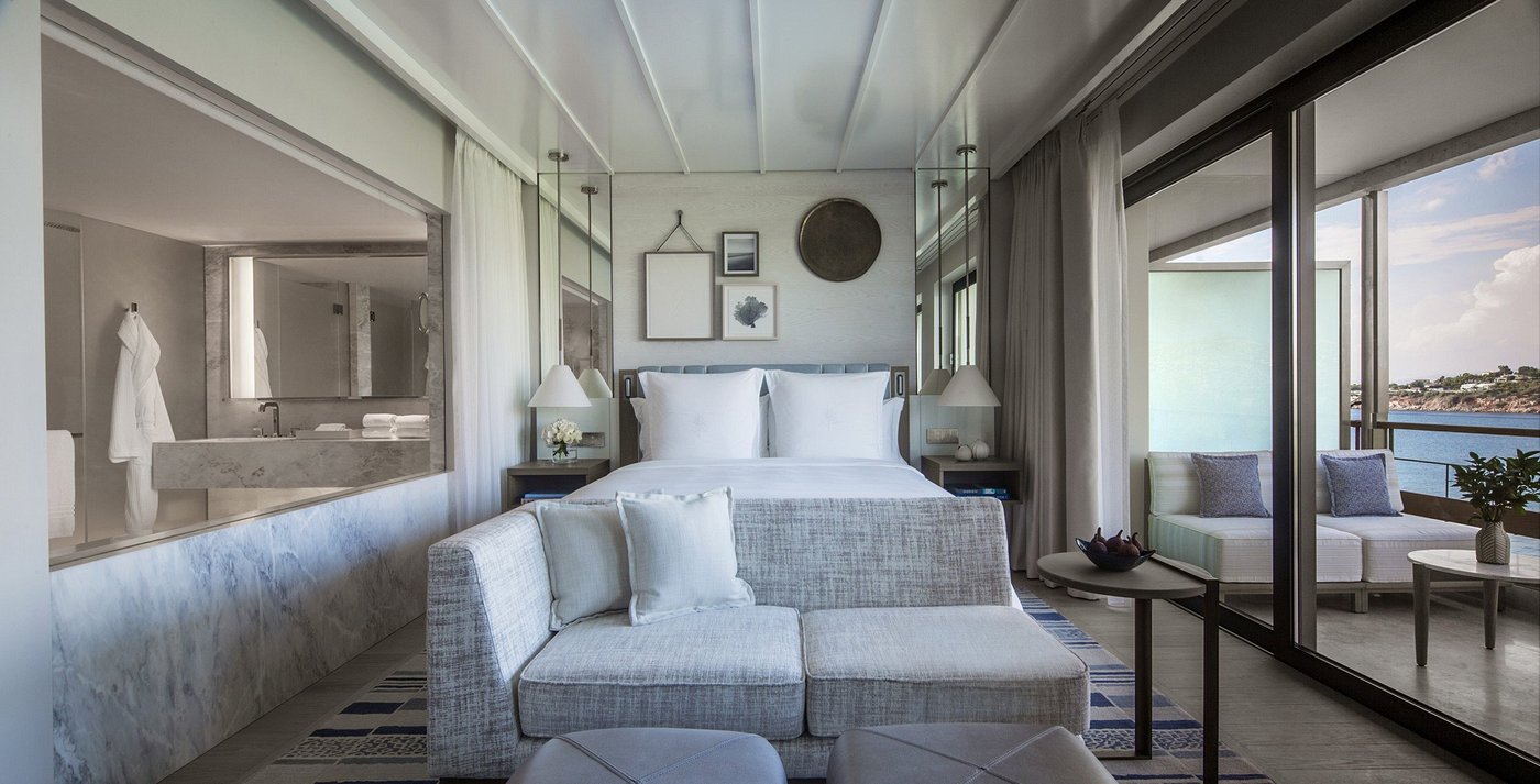 Rooms and suites are generous in size, with many featuring private terraces, outdoor lounges, or even their own pools. Interiors lean toward soft colours, natural textures, and a relaxed modern Greek aesthetic that encourages slow living and comfort.