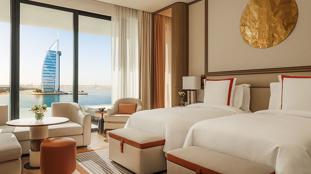 The hotel features spacious rooms and suites, many with private terraces overlooking the water. Interiors are bright and elegant, with natural tones, marble bathrooms, and thoughtful details that reflect modern Arabian hospitality. Experiences at Jumeirah Marsa Al Arab are centered on wellbeing, relaxation, and enjoying good food. The spa offers a variety of treatments and quiet spaces, along with indoor and outdoor pools, a fitness centre, and activities for children.